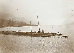 Die Flöße auf dem Pine Creek in Tioga County, Pennsylvania, waren oft solide gebaut. Das linke hier abgebildete Floß diente als Küche und Esszimmer, das mittlere als Schlafzimmer und das rechte als Stall für die zum Treideln verwendeten Pferde. Diese Flöße wurden nur für einen Holztransport gebaut und am Ende der Reise als Schnittholz verkauft. Im Hintergrund ist die Bahnlinie der Jersey Shore, Pine Creek and Buffalo Railway zu sehen.