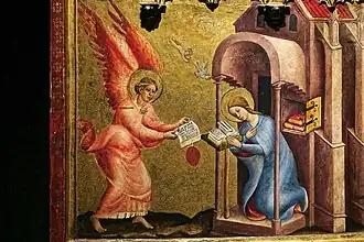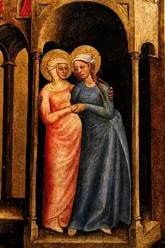 Der Altar zeigt in geöffnetem Zustand einen Marienzyklus, beginnend mit der Verkündigung am linken Flügel oben.[3] Der Zyklus setzt sich fort an den Nischenflügeln mit Szenen von der Heimsuchung und der Geburt Christi, dann mit der Anbetung der Könige wieder am linken Flügel sowie abschließend am rechten Flügel mit dem Tod und der Krönung der Muttergottes. Es sind insgesamt sechs Altarbilder, die das Leben Mariens erzählen. In den Wimpergen befinden sich die Brustbilder der Heiligen Katharina, Ursula, Margarete und Elisabeth. In der leeren Mittelnische stand ursprünglich eine Skulptur, die verloren gegangen ist. Sie bildete das Zentrum des Flügelaltars. Es wird angenommen, dass es eine sitzende Madonna mit Kind war.