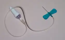 Die Flügelkanüle besteht aus einer meist sehr feinen Kanüle, die mit zwei biegsamen Flügeln aus Kunststoff und einem Schlauch versehen ist. Mit Hilfe der zusammengeklappten Kunststoffflügel kann die Flügelkanüle sicher und präzise während der Punktion geführt werden. Nach der Punktion können die Kunststoffflügel flach auf die Haut geklappt und mit einem Heftpflasterstreifen fixiert werden.[1] Die Flügelkanüle hat den Vorteil, sich durch Bewegungen am Luer-Lock, z. B. beim Wechseln von Blutentnahmeröhrchen, nicht mitzubewegen und wird deshalb meist bei sehr kleinen, fragilen Venen verwendet. Auch ist die Anwendung schmerzärmer und venenschonender als bei dickeren Kanülen.