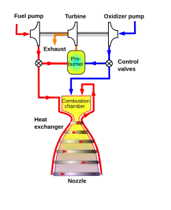 Beim Nebenstromverfahren (englisch Gas generator cycle oder Open cycle) wird ein Teil des zur Brennkammer gepumpten Treibstoffes und Oxidators abgezweigt und in einer gesonderten Brennkammer verbrannt. Dabei wird eine unstöchiometrische Verbrennung (Treibstoff- oder Oxidatorüberschuss) angestrebt, um die Heißgastemperaturen auf ein für die Turbinenwerkstoffe verträgliches Maß zu senken (400 bis 833 K).[13] Nachdem der Heißgasstrom in der Turbine seine Arbeitsleistung erbracht hat, wird das entspannte Heißgas entweder zur Düsenkühlung verwendet oder über ein Auspuffrohr (englisch exhaust) neben der Schubdüse in die Umgebung entlassen. In dieser Triebwerksvariante existieren also mindestens zwei Ströme (Hauptstrom zur Haupt-Brennkammer und im Nebenstrom die Treibstoffe zur Gaserzeuger-Brennkammer; ggf. ein dritter Strom zur Düsen- und Brennkammerkühlung). Circa fünf Prozent des gesamten Treibstoffes einer Stufe werden so durch unvollkommene Verbrennung zum Pumpenantrieb verbraucht und stehen so nicht mehr der eigentlichen Schuberzeugung des Raketenmotors zur Verfügung; andererseits handelt es sich um eine erprobte, bewährte und beherrschbare Technik. Das Nebenstromverfahren ist die älteste und am meisten verbreitete Variante. Viele größere Raketentriebwerke funktionieren nach diesem Prinzip, unter anderem das F-1 der Saturn-Unterstufe S1C.[6] Eine Untervariante ist das Verwenden eines separaten Treibstoffes für den Turbopumpen-Gasgenerator wie bei der V2/A4-Rakete oder dem RD-107 der sowjetischen Sojus/R7-Rakete, welche beide nach dem Prinzip des Walter-Antriebs die katalytische Zersetzung von Wasserstoffperoxid zur Erzeugung des Pumpen-Arbeitsgases verwenden.