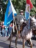 2:5 | 1986 | Die Flagge wurde 1986 auf Initiative des Provinzabgeordneten Dario Augusto Moreno verabschiedet. Sie zeigt drei vertikale Streifen in den Farben der Nationalflagge hellblau-weiß-hellblau. Auf dem weißen Streifen befindet sich ein roter Streifen, in dessen Mitte auf einer goldenen Sonne ein rotes Jakobskreuz abgebildet ist. Die Sonne hat 8 gerade und 8 geflammte Strahlen. |