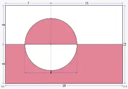 Die Flagge Grönlands zeigt zwei gleich breite waagerechte Bänder, von denen das obere weiß und das untere rot ist. Darüber liegt, leicht zum Mast verschoben, eine große Scheibe, deren obere Hälfte rot und untere Hälfte weiß ist. Die gesamte Flagge ist 12 mal 18 Einheiten groß; die Scheibe hat einen Durchmesser von 8 Einheiten, ihr Mittelpunkt hat einen Abstand von 7 Einheiten vom Mast und ist senkrecht zentriert.[33]