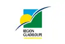 Das Logo der Region Guadeloupe zeigt auf einem weißen Feld eine stilisierte Sonne und einen Vogel auf einem grün-blauen Quadrat. Darunter stehen die Worte REGION GUADELOUPE, die gelb unterstrichen sind.[1]