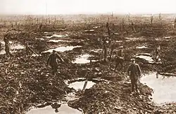 Australische Soldaten in einer zerstörten Landschaft (Chateau Wood, nahe Hooge), Ende Oktober 1917 (Dritte Flandernschlacht)Trichterfeld bei Geluveld nahe Ypern