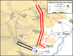Schlacht von Leuthen: Die Österreicher (rot) haben ihren linken Flügel zum Schutz der Flanke nach hinten umgebogen. Die preußische Armee (blau) geht gegen diese Flanke vor und hat zwischen ihren Treffen an den Seiten Truppen zum eigenen Flankenschutz aufgestellt