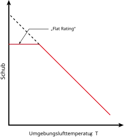Die zwei wesentlichen Faktoren, die die maximale Leistung einer Turbine begrenzen, sind die Verdichtung und die Turbineneintrittstemperatur. Mit sinkender Lufttemperatur erhöht sich der maximal erreichbare Schub, die Leistung einer Turbine wird aber nach oben hin durch die maximal zulässige Verdichtung gekappt. Der Schub wird nicht weiter erhöht, sondern bleibt konstant (flat). In der Regel ist ein Triebwerk so ausgelegt, dass es bis zu einer Temperatur von 29 °C noch den maximalen Standschub abgeben kann. Bei höheren Außentemperaturen greift hingegen die maximal zulässige Turbineneintrittstemperatur als limitierender Faktor.