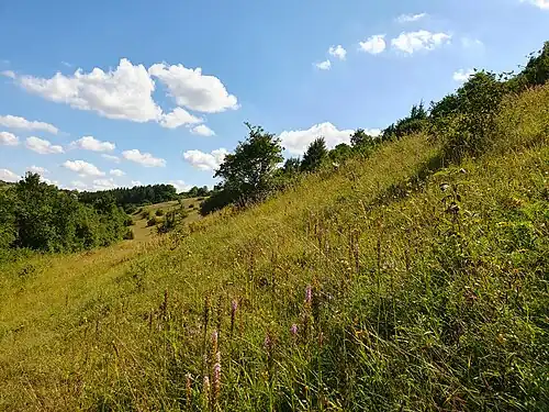 ![]() Nördlicher Teil des Naturschutzgebietes Kahlhof mit der Burg Katzenstein im mittleren Hintergrund | ||