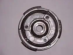 Weiterhin ist eine zusätzliche indirekte Wirkung zur Erhöhung des Anpressdruckes möglich. Dazu werden die Klappen längs des Radius ebenfalls mit einem Belag versehen (s. Abbildung). Schwingt die Klappe nach außen, wird dieser Belag gekippt und presst dadurch das lose Ende der benachbarten Klappe zusätzlich gegen die Glocke. Diese Ausführung kann schon bei geringen Drehzahlen einen hohen Anpressdruck erzielen.