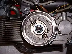 Die Klappen der inneren Kupplung sind auf der äußeren Glocke montiert, die zur äußeren Kupplung gehört. Über den inneren Klappen ist die – im mittleren Bild nicht sichtbare – innere Glocke angebracht. Wenn man die Pedale tritt, drehen sich die inneren Klappen. Ist eine ausreichende Drehzahl erreicht (ein Tritt genügt), wird die innere Glocke angekuppelt und so der mit ihrer Achse verbundene Motor gestartet.