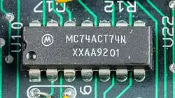 | 7474 | D | CMOS:7400 | 2× D-Flipflop, Komplementärausgänge | ||