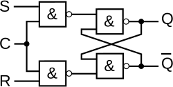JK-Flipflops basieren auf dem asynchronen RS-Flipflop, sind aber flankengesteuert oder als Master-Slave-Flipflop ausgeführt. Die Bedeutung bzw. die Herkunft der Eingangsbezeichnungen J und K ist nicht erklärbar.[16][17] Mit dem Taktsignal und der Eingangsbelegung J = 1 und K = 0 wird am Ausgang eine 1 erzeugt und gespeichert, alternativ bei K = 1 und J = 0 eine 0. Der Zustand J = K = 1 ist erlaubt; in diesem Fall wechselt der Ausgangspegel mit jeder wirksamen Flanke des Taktsignals. Dieses Verhalten lässt die Bezeichnung als Toggle-Flipflop zu. Für J = K = 0 bleibt der letzte Ausgangszustand erhalten. Die charakteristische Gleichung lautet (mit J, K, Q bis zur Flanke und Q' nach der Flanke)[18]
