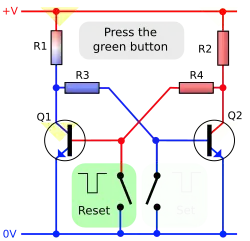 Gemeinsam ist jedoch allen, dass sie zwei stabile Zustände haben, welche an einem Ausgang festgestellt werden können. Diese Zustände werden „gesetzt“ (set) und „zurückgesetzt“ (reset) genannt. Zwischen diesen Zuständen kann durch Signale an den Eingängen umgeschaltet werden. Üblicherweise ist neben dem Ausgang Q ein weiterer Ausgang Q vorhanden, an dem der negierte Wert von Q anliegt. Der Einschaltzustand ist bei einem einfachen Flipflop aus zwei symmetrisch angeordneten bipolaren Transistoren (wie im Bild „Bistabile Transistor-Kippstufe“) nicht definiert. Dieser kann mittels eines Kondensators an einem der beiden Eingänge festgelegt werden.