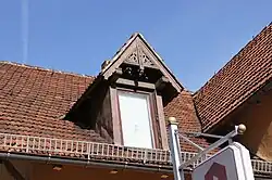 Zwei symmetrisch beiderseits des Risalits eingebaute Dachgauben mit neugotischen Holzgiebeln lassen Tageslicht in die oberen Räumlichkeiten.[3]