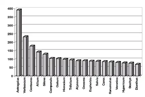 Die bei weitem artenreichste Gefäßpflanzengattung Anatoliens ist Astragalus (Tragant). Sie scheint sich hier mitten im Prozess der Artbildung zu befinden, was die Unterscheidung der vielen nächstverwandten Sippen für den Nichtspezialisten oft sehr erschwert. Tragante sind besonders typisch für baumlose, trockene Lebensräume. Solche waren vermutlich schon in prähistorischer Zeit in Inneranatolien nicht selten. Eine geradezu explosionsartige Ausbreitung erfuhren sie aber durch den Menschen in historischer Zeit, was wohl die Artbildung zusätzlich stark angekurbelt hat. In Abhängigkeit von den jeweiligen Umweltbedingungen hat sich in der Gattung Astragalus eine erstaunliche Vielfalt von Lebensformen entwickelt, von winzigen einjährigen Arten bis zu kleinen Sträuchern und die für die trockenen Gebirge Zentral- und Südanatoliens charakteristischen Dornpolster. Allerdings wurde diese sowohl gegen Beweidung als auch gegen Sommertrockenheit schützende Lebensform nicht von Astragalus exklusiv erfunden. Beispiele von gleichgerichteter (konvergenter) Evolution sind die eindrucksvollen Dornpolster von Onobrychis cornuta (Fabaceae) bzw. von Acantholimon sp. (Plumbaginaceae). Sogar manche Asteraceae (in der Türkei z. B. Centaurea urvillei, Centaurea iberica) und Caryophyllaceae (z. B. Minuartia juniperina) entwickelten sich in diese Richtung.