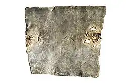Überwiegend wurden etwa 3 bis 4 mm starke Bleche aus Blei gefunden. Dieses haltbare Material war wesentlich beliebter als andere Schriftträger, weshalb bisher lediglich zehn römische defixiones aus anderen Materialien bekannt sind.[24] Jedoch erklärt die gute Haltbarkeit von Blei nicht den Vorzug gegenüber anderen dauerhaften Materialien. Zum einen stellte Blei ein Nebenprodukt des Silberabbaus dar, war bequem beschriftbar und wurde in der Antike im Alltag sehr häufig verwendet. Zum anderen hat Blei spezielle Eigenschaften wie Schwere oder Kälte, ist giftig und wurde mit Wert- und Nutzlosigkeit assoziiert, die es als rituelles Trägermaterial eines Fluches geeignet erscheinen ließen.[25] Darauf nimmt eine Tafel des 2. Jahrhunderts aus Carnuntum Bezug, die sich gegen den Dieb eines Gefäßes richtet: „So wie jenes Blei Gewicht hat, so soll auch den Eudemus euer Zorn treffen.“[26] Zur Herstellung der Täfelchen wurde geschmolzenes Blei auf eine glatte Oberfläche gegossen, in die gewünschte Stärke ausgetrieben und meist rechteckig zugeschnitten.[27] In der Regel waren die Bleitafeln nicht größer als 12 × 8 cm.[28] Andere Exemplare weisen die Form so genannter tabulae ansatae auf, an deren Rahmen meist dreieckige Henkel befestigt sind und die in Heiligtümern gefundenen Votivtafeln ähneln. Wesentlich seltener verwendete Materialien für Fluchtafeln sind Hartzinn – sie stammen vor allem aus dem britannischen Raum –, Ostraka, Muscheln, Gemmen, Papyrus und Wachs.[29]