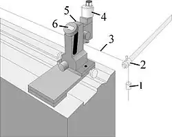 Zum Aufbau der Messanordnung wird ein Draht an einem Spindelstock oder einer speziellen Halterung befestigt und am Ende des Bettes über eine Umlenkrolle (2.) geführt sowie mit einem Gewicht (1.) straff gespannt. Der Fluchtlinienprüfer wird auf einem Führungsschlitten oder einer entsprechenden Einrichtung aufgesetzt. Die genaue horizontale Ausrichtung des Fluchtlinienprüfers erfolgt dabei über eine Libelle (5.) am Tubus des Mikroskops. (4. Mikroskop mit Schnittbildokular, 6. Messwertanzeige)