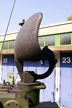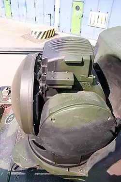 Mittig an der Turmfront befindet sich das Folgeradar (bei der Bundeswehr im Ku-Band) mit einer Reichweite von 15 Kilometern, zwei Frequenzen und Phasendetektor. Es ist als Monopulsantenne ausgelegt – unter dem Radom befinden sich vier Hornstrahler, die das reflektierte Signal phasensensitiv empfangen.[21] Das Folgeradar schwenkt zur Zielerfassung selbstständig aus und nach der Bekämpfung wieder ein, um die beschussempfindliche Radarantenne und den Laserentfernungsmesser, der auf der Oberseite des Folgeradars montiert ist, zu schützen. Wie beim Turm oder anderen rotierenden Bauteilen erfolgt die Übertragung von Energie, Signalen und anderen Medien (beispielsweise Druckluft) über Schleifringe, im Falle des Folgeradars ein 225-Wege-Schleifring.[22] Beide Radaranlagen arbeiten vollständig unabhängig voneinander, besitzen aufgrund der Auslegung als Puls-Doppler-Radar eine sehr gute Entstörung gegen Festziel-Echos (Clutter) sowie elektronische Gegenmaßnahmen (ECM) und sind mit Eigendiagnosesystemen (built in test equipment) für die Elektronik und das Radar ausgestattet.[1] Die Anzeige des Suchradars erfolgt auf einem klassischen runden Radarschirm (PPI-Scope, Durchmesser 15 cm).[23]