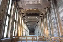 Die Gebäude wurden überwiegend in Stahlbeton- oder Backsteinbauweise ausgeführt und an den Sichtflächen mit Natursteinplatten verkleidet. Die der Haupthalle quer vorgelagerte 90 m breite, 9 m tiefe und 15 m hohe Eingangshalle war bei Kriegsende bereits fertiggestellt. Um Baumaterial für die Sichtflächen der stark beschädigten Haupthalle gewinnen zu können, wurde die Eingangshalle durch den Einbau einer Beton-Zwischendecke knapp unterhalb der 21 großen Hallenfenster geteilt und so in der Raumhöhe deutlich reduziert. Die unterhalb der Zwischendecke entstandene Eingangszone wirkt dadurch relativ unscheinbar. Der oberhalb der Zwischendecke verbliebene, rund zehn Meter hohe Rest der ursprünglichen Eingangshalle wird nicht genutzt – er kann bei Führungen besichtigt werden. In der Haupthalle ist die ursprünglich in 19 m Höhe hängende stark beschädigte Stuckdecke durch eine auf 15 m abgehängte Kassettendecke ersetzt worden. In den elf 5,60 m × 22,50 m großen Kassetten ist die Deckenstrahlungsheizung untergebracht. Diese Decke ist begehbar, um die Heizung und die Beleuchtung warten zu können.
