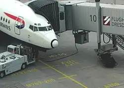Es gibt 28 Abstellpositionen für Luftfahrzeuge; 5 Abstellpositionen sind mit Fluggastbrücken ausgestattet.[4] Es gibt insgesamt 12 Gates mit einem Andocksystem, darunter die Positionen mit Fluggastbrücken. Der Flughafen ist konzipiert für Luftfahrzeuge bis zu 80 m Spannweite (ICAO Luftfahrzeugkategorie F). Das heißt, dass z. B. die Flugzeuge Airbus A380 und Antonow An-124 landen, starten und abgefertigt werden können. Auch wenn auf absehbare Zeit nicht mit planmäßigen Flügen von/nach Dresden im A380 im öffentlichen Passagierbetrieb zu rechnen ist, so ist die Fähigkeit, den A380 abzufertigen, für die wirtschaftliche Lage des Flughafens und der Region wichtig, da die Elbe Flugzeugwerke (siehe unten) diverse Aus- und Umbaumaßnahmen an Flugzeugen auch dieser Bauserie vornehmen.