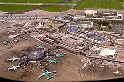 Der Flughafen von Dublin wurde im Jahre 1940 eröffnet. Dublin Airport erfuhr ein rasantes Wachstum und hatte bis 2008 bei einem Jahreszuwachs von 15 % die 23,4-Millionen-Passagier-Marke übersprungen, bevor die Rezession gegen Ende des Jahrzehnts auch dem Ausbau des Flughafens Probleme bereitete. Dennoch wurde im November 2010 das neue, für 600 Mio. € errichtete Terminal T2 eröffnet.[4] Damit hat der Flughafen eine theoretische Gesamtkapazität von 35 Millionen Passagieren im Jahr.[5] Im Jahr 2015 wurde mit 25 Millionen Passagieren die Zahl von vor der Finanzkrise erstmals wieder übertroffen.