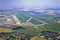 Das ursprünglich ovale Flugfeld besaß jeweils ein befestigtes Ende in Ost-West-Richtung zum Starten von Motorflugzeugen; das westliche Ende wurde später in das Vorfeld integriert. Unter US-Verwaltung war zunächst die Piste 08/26 ausgeschrieben,[7] bis 1948 die Bahn 07/25 aus gelochten Stahlplatten mit 1585 Meter Länge in Betrieb genommen wurde.[8] 1949 begann man mit dem Ausbau der Start- und Landebahn in bituminöser Bauweise auf 1907 Meter Länge und 60 Meter Breite, der am 22. November 1949 abgeschlossen werden konnte.[9][10] 1954 waren neben der befestigten Landebahn 07R/25L zwei Graspisten (07L/25R und 12/30) verzeichnet.[7]