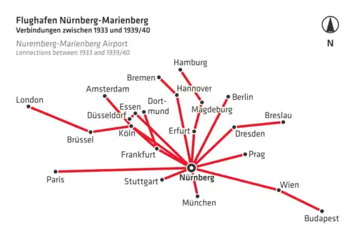 Lediglich der Linienverkehr zwischen der „Reichshauptstadt“ Berlin, der „Stadt der Reichsparteitage“ Nürnberg und der „Hauptstadt der Bewegung“ München wurde noch bis zum Herbst 1940 aufrechterhalten, ehe der Flughafen nur noch militärischen Zwecken diente.[3]