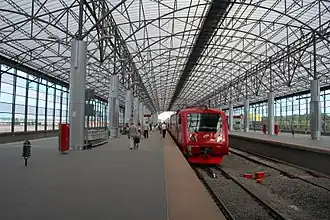 - Die schnellste und komfortabelste Verbindung ist die Bahnlinie Aeroexpress, dessen 27 Züge seit 2008 halbstündlich vom Belarussischen Bahnhof (Metro-Stationen Belorusskaja) in 35 Minuten zu dem Aeroexpress-Terminal fahren. Letzteres grenzt unmittelbar an das Terminal E an, mit dem es durch einen Übergang direkt verbunden ist; über das Terminal E gelangt man ebenso direkt in das Terminal F. Zudem pendeln vom Aeroexpress-Terminal kostenlose Shuttle-Busse in 10 Minuten zum Terminal D und alle 15 Minuten zu den wesentlich weiter entfernten Terminals B und C. Der Standard-Fahrpreis für den Expresszug liegt zwischen den Taxis und den Marschrutkas respektive Linienbussen. Zudem gilt das Aeroexpress-Ticket als Verbund-Fahrkarte mit dem Namen Metro+ auch für die Moskauer Metro. Der Aeroexpress verkehrt im 30- bzw. 60-Minuten-Takt.[7] Umgekehrt sparen Passagiere, die von den Terminals B oder C einen innerrussischen Flughafen anfliegen, viel Zeit mit dem Einchecken und der Gepäckaufgabe schon am Belarussischen Bahnhof.