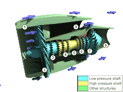 Funktionsprinzip eines Strahltriebwerks: (1) Triebwerksgondel, (2) Fan, (3) Niederdruckkompressor, (4) Hochdruckkompressor, (5) Brennkammer, (6) Hochdruckturbine, (7) Niederdruckturbine, (8) Kerndüse, (9) Mantelstromdüse