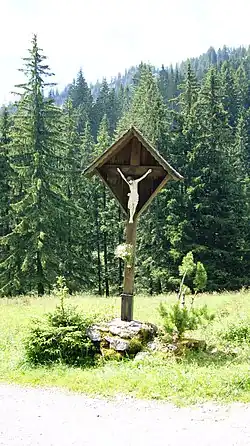 Wegkreuz an der Kreuzung der Straße von Schuttannen, zur Emser Hütte und zu Pfarrers Älpele auf Hohenemser Gemeindegebiet in Vorarlberg, Österreich.