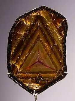 | Farbe | braun,[4] in Zonen auch grün, blau, gelb, rosa oder selten farblos |