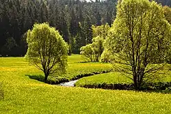 • Mäandernde Lauchert. Zwei Kilometer weiter, vor Bronnen, setzt die relativ kleine Lauchert für die nächsten 19 Kilometern in besonders trägen Mäandern ihren Weg im flachen, mit durchschnittlich 200 Meter recht breiten, Tal fort.