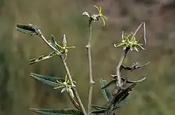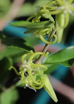 Die sitzenden oder kurz gestielten Blütenstände werden seitlich, außerhalb der Achseln gebildet. Es sind mehrere Einzelblüten pro Blütenstand vorhanden und sie stehen in einer Scheindolde bis gebüschelt an kurzen Stielen. Die Kelchblätter sind dreieckig bis lanzettlich geformt. Die etwa 5 bis 15 Millimeter lange Knospe ist verdreht. Die zylindrische bis glockige Kronröhre ist kürzer als die mehr oder weniger verdrehten Kronzipfel. Die grün oder gelb gefärbten Kronzipfel sind innen papillös oder mit Flaumhaaren besetzt und an den Rändern zurück gebogen. Die zweireihige Nebenkrone ist sitzen und mehr oder weniger zylindrisch verwachsen. Sie enthält reichlich Nektar und ist längsgefurcht bis geriefelt. Die interstaminale Nebenkrone ist als Saum verwachsen und am Rand leicht mit Zähnen besetzt. Bei der staminalen Nebenkrone wird ein dreizipfeliger äußerer Fortsatz ausgebildet, der einen inneren tiefer liegenden Fortsatz mehr oder weniger umschließt. Das Gynostegium ist sitzend. Die dreieckig bis eiförmigen Staubbeutel stehen aufrecht und tragen an der Spitze einen eiförmigen, sterilen, durchscheinenden und aufgeweiteten Fortsatz, der höher als der Griffel steht und diesen verdeckt. Die eiförmigen bis breit ellipsoiden und flachen Pollinien sind direkt am Corpusculum angesetzt und werden 0,2 bis 0,3 Millimeter lang.