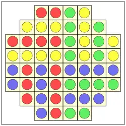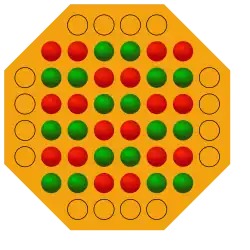 - Gespielt wird auf einem Brett mit 6×6 Feldern und je 4 zusätzlichen Feldern an jeder Seite (siehe Bild). Am Spielbeginn wird auf jedes der 6x6 mittleren Felder je ein Stein gelegt, so dass das abgebildete Muster entsteht.