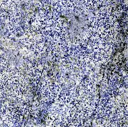 - Naujait (nach Naujakasik, heute Naajakasik, Ilímaussaq-Komplex, Süd-Grönland): lokaler Name für eine agpaitische Nephelin-Sodalithsyenit-Varietät mit poikilitischer Textur, wo kleine Sodalith-Körner in großen Alkalifeldspat-, Arfvedsonit-, Aegirin- und/oder Eudialyt-Körnern eingeschlossen sind. Der Sodalith-Gehalt des Gesteins kann 50 % erreichen.[10] Der Ilímaussaq-Komplex ist die Typlokalität des Sodaliths.[41][42][43]