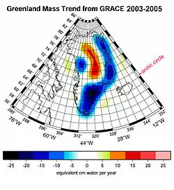 Die Massenveränderungen Grönlands werden mit Satelliten (z. B. mit GRACE, Cryosat und ICESat) erfasst. In den letzten 20 Jahren hat sich die Schmelze in den frostfreien Monaten (Mai–September) deutlich verstärkt. Insgesamt verlor Grönland 1996 noch knapp 100 Gigatonnen an Masse, ein Wert vergleichbar mit den 1960er Jahren, während 2007 fast 270 Gigatonnen verloren gingen.[20] 2007 ist erstmals eine negative Massenbilanz für die Höhe ab 2000 m festgestellt worden.[16]