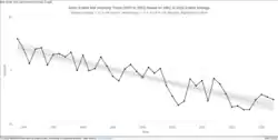 Zu Beginn der Satellitenbeobachtung 1979 und in den Folgejahren betrug die durchschnittliche Ausdehnung der Eisfläche noch ungefähr 7,5 Mio. km². Zwischen 1979, dem Beginn der modernen Satellitenbeobachtung, und 2005 nahm die beobachtete Eisfläche um 1,5 bis 2,0 % pro Dekade ab. Der Eisflächenrückgang ist generell im September am stärksten, es ist traditionell der Monat mit der geringsten Ausdehnung; der Eisrückgang betrug bis Mitte der 2000er Jahre in diesem Monat 8,6 ± 2,9 % pro Jahrzehnt.[70] Bis 1953 in die Vergangenheit erweitert – um nicht mit Satelliten beobachtete Jahre –, betrug die Abnahme noch 7,7 ± 0,6 % pro Dekade.[71]