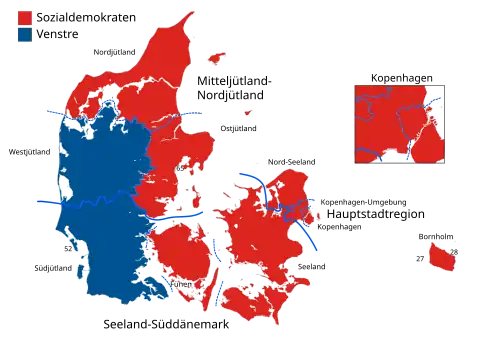 Die Sozialdemokraten lagen in sieben der zehn Großwahlkreise in Führung, mit Bornholm als bestem Ergebnis. Einzig in West- und Südjütland, sowie in Nordseeland, konnte die Venstre eine Mehrheit auf sich vereinen. Radikale Venstre und Alternativet verzeichneten ihr bestes Ergebnis jeweils im Kopenhagener Großwahlkreis (storkreds), wo sie nur knapp hinter den Sozialdemokraten abschnitten. Die Dansk Folkeparti hatte ihr bestes Ergebnis erneut in Südjütland, war nun allerdings auch dort weit von einer Spitzenposition entfernt.[14]