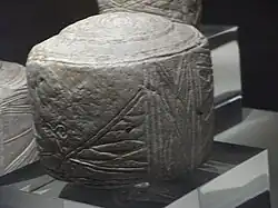 Der Fund besteht aus drei kleinen zylindrischen Kalksteinobjekten in der Form von Trommeln mit Durchmessern von 14,6 sowie 12,7 und 10,2 cm und Höhen von 11,8 sowie 10,5 und 8,6 cm. Die Verwendung von „Magnesium-Kalkstein“ (englisch magnesian limestone)[2] statt der ursprünglich publizierten Kreide würde bedeuten, dass sie mindestens aus einer Entfernung von etwa 70 km, in der Nähe von Ripon im County Durham stammen, wo die nächsten Aufschlüsse des Kalksteins liegen. Es würde auch ein höheres Niveau der Ritzungen implizieren, da Magne Kalkstein wesentlich härter ist als Kreide. Die Oberseiten der Trommeln scheinen Deckel zu bilden.