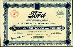 Die Société Française des Automobiles Ford wurde 1916 von Percival Perry, dem damaligen Vorstandsvorsitzenden von Ford of Britain, in Bordeaux gegründet[1]. Wie auch die anderen europäischen Ford-Niederlassungen montierte auch Automobiles Ford das T-Modell, bis 1925 in Bordeaux und dann bis 1927 in Asnières-sur-Seine bei Paris. Das A-Modell wurde 1927–1931 gebaut und das Y-Modell 1932–1934. Auch führte man das B-Modell aus den USA ein, aber die Einfuhrzölle machten es sehr teuer; daher war es in Frankreich nicht sehr beliebt[1].