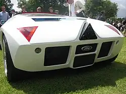 Das Typische des Ford GT90 ist wohl seine weiße Karosserie, die aus Glasfaserverbundmaterial besteht, und seine auf verstärktem Aluminium aufbauende Struktur. Der Heckspoiler liegt wie ein Schild über dem Dreieck, das die Auspuffrohre aufnimmt.