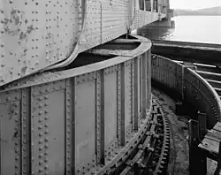 Der etwa 5000 t[21] schwere und 160 m lange Fachwerkträger der Drehbrücke ist auf einem kombinierten Mittel- und Rollenkranzlager gelagert und wird von einem runden Strompfeiler mit einem Durchmesser von 14 m getragen, der wiederum auf einem quadratischen Fundament mit Seitenlängen von 16 m × 16 m steht. Das Rollenkranzlager – ein Wälzlager – hat einen Durchmesser von knapp 13 m und trägt eine Trommel des gleichen Durchmessers aus Vollwandträgern. Der Rollenkranz besteht aus 72 Stahlrollen mit einem Durchmesser von 51 cm. Er wird durch 8 radial zum Mittellager verlaufende Streben in Position gehalten und ist hier ebenfalls rotierbar gelagert. Der innere Aufbau des Mittellagers – ein Gleitlager – besteht aus drei horizontal liegenden und übereinander angeordneten Metallscheiben. Die obere und untere Scheibe aus Stahl dienen als Lagerschalen und haben nach innen zeigende konkave Flächen, zwischen denen sich eine geschmierte beidseitig konvexe Scheibe aus Phosphorbronze befindet. Die beiden unteren Scheiben haben einen Durchmesser von je 1,2 m und die 16 radial zum Zentrum verlaufenden Streben der Trommel liegen auf der Oberseite der oberen, etwas größeren Lagerschale auf (zum Aufbau eines Mittellagers einer ähnlichen Doppelstockbrücke siehe unter I Street Bridge). Vergleichbar ist der Aufbau mit zwei übereinander liegenden Rädern, wobei der Rollenkranz (unten) und die Trommel (oben) die Felgen, die Streben die Speichen und das Mittellager die Nabe bzw. die Achse darstellen.[11]