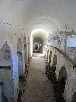 Hinter dem Eingangsportal führt ein Gang im rechten Winkel und einigen Stufen zum Korridor mit der Batterie. Davor finden sich zwei hintereinander liegende Räume, in denen womöglich die fertigen, mit den Treibladungen aufmunitionierten 149-mm-Granaten deponiert waren. Neben den Stufen befand sich ein kleiner Lastaufzug für den Transport der Artilleriegranaten zu den vier Panzertürmen. An den beiden Enden des Korridors liegen größere fensterartige Öffnungen, die zum Abzug der Rauchgase nach dem Abfeuern der 149/35-A-Kanonen dienten. Vom Korridor führen einige steile Stufen in die vier Panzertürme, in denen sich die 149/35-A-Kanonen unter den Panzerkuppeln befanden. Die oberen Treppenausgänge sind später zugemauert und die Geschützstände mit Zement aufgefüllt worden. Neben den Aufgängen zu den Panzertürmen befinden sich kleine Räume für den Munitionsvorrat der Turmgeschütze. Im Raum am äußersten linken Ende des Batterieblocks war die Feuerleitstelle untergebracht, die mit Telefonleitungen mit dem außerhalb des Werkes liegenden Artilleriebeobachter verbunden war.[24]