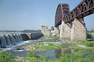 Der Louisville and Portland Canal wurde 1874 verstaatlicht und vom United States Army Corps of Engineers übernommen. Es folgten mehrere Erweiterungen der Schleusen und des unterhalb der Brücke verlaufenden Kanals, was auch den Bau der Hubbrücke bedingte. Durch die Entfernung des Mittelpfeilers der alten Drehbrücke konnte hier die Breite der Fahrrinne von 32 m auf über 70 m verbreitert werden.[26] Weiterhin wurde in Höhe der Falls of the Ohio eine Staustufe errichtet, deren Staumauer man in den 1920er-Jahren mit einem bei Niedrigwasser aufrichtbaren Segmentwehr (wicket dam) und einem Laufwasserkraftwerk als Lock and Dam No. 41 erweiterte. Ab Ende der 1950er-Jahre erfolgten weitere Vergrößerungen der Schleusenanlagen und die Errichtung eines neuen Drucksegmentwehrs (Tainter gates), dabei wurde die letzte Fahrrinne unter dem größten Fachwerkträger der Brücke verschlossen. Im Jahr 1960 benannte man die Staustufe in McAlpine Locks and Dam um, deren Reservoir die Stromschnellen heute größtenteils überdeckt.[27][28] Nur im nördlichen Teil hinter der Hochwasserentlastung sind vor der Brücke noch Teile erhalten, die sich heute im Falls of the Ohio State Park befinden.