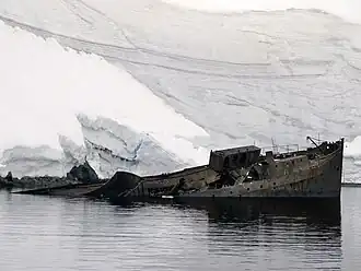 ![]() Wrack des norwegischen Fabrikschiffs Guvernøren vor Enterprise Island im Foyn Harbour | ||
