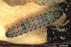 Die Larven sind im letzten, fünften Stadium 10 bis 13 mm lang. Ihr Körper ist weißlich, der Kopf zuweilen rosa-braun. Prothorakales Schild und Analplatte sind hellbraun. Die Larve besitzt große haarige, dunkelrote Warzen, sowie einen Analkamm.