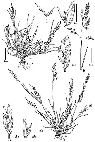 A–E Poa annua L. A Habitus B Blütenstand C glumes D Einzelblüte mit Vorspelze und Staubbeuteln E Einzelblüten F–H Poa infirma Kunth F Habitus G Ährchen H Einzelblüte mit Vorspelze und Staubbeuteln Zeichnungen von Soreng (2007).