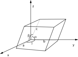 Definition der Einheitszelle über die Länge der Kanten a, b, c und die Winkel α, β, γ[2]