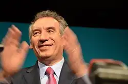 Am 22. Februar 2017 bot Bayrou, nachdem zuvor über mehrere Monate über seine vierte Kandidatur bei der Präsidentschaftswahl 2017 spekuliert worden war, dem aussichtsreich erscheinenden Präsidentschaftsbewerber Emmanuel Macron ein Bündnis an, „um Frankreich einen wahren Wechsel zu ermöglichen“.[15] Macron wurde am 7. Mai 2017 zum Staatspräsidenten gewählt. Er ernannte kurz darauf Édouard Philippe zum Premierminister und beauftragte ihn, ein Kabinett zu bilden. Dieses wurde am 17. Mai 2017 berufen; Bayrou war darin stellvertretender Premierminister (Ministre d’État, „Staatsminister“) und Justizminister. Bayrou gab am 21. Juni 2017 bekannt, wegen einer Scheinbeschäftigungsaffäre dem nach der Parlamentswahl neuzubildenden Kabinett Philippe II nicht mehr anzugehören.[16] Seine Parteikolleginnen Sylvie Goulard (Verteidigungsministerin) und Marielle de Sarnez (Europaministerin) verzichteten aus dem gleichen Grund.[17]