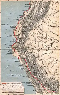 Im September machte er sich mit seinen Leuten weiter nach Süden auf. Nach Durchqueren der Sechura-Wüste drangen die spanischen Eroberer mit ihrer einfachen Ausrüstung in die mehrere tausend Meter hohen Anden, das Kernland des Inkareichs vor. Auf ihrem Weg wurden sie beobachtet und immer wieder von Boten des Inkaherrschers besucht.