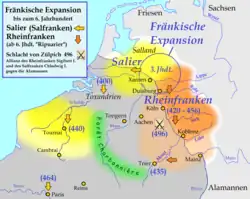 In der Gründungsphase des Bundes der Franken im 3. Jahrhundert hatten sich die nordwestlich und am Niederrhein siedelnden Gruppen zusammengeschlossen; aus den vom unteren Niederrhein bis zum Salland an der IJssel siedelnden Gruppen bildete sich der Verband der Salfranken. Die vom Großraum Köln über den Mittelrhein und südlich davon bis zur Lahn als foederati angesiedelten Gruppen gingen nach und nach in den Rheinfranken und in den von diesen abstammenden Moselfranken auf.